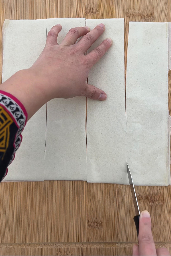 - Cut the pastry sheets vertically into 4 equal section. Using the instructional reel above and the liy mixture, make 55-60 piccalilli squares. Ensure the corners are tightly wrapped and not exposed. (A detailed reel will be coming soon on this)