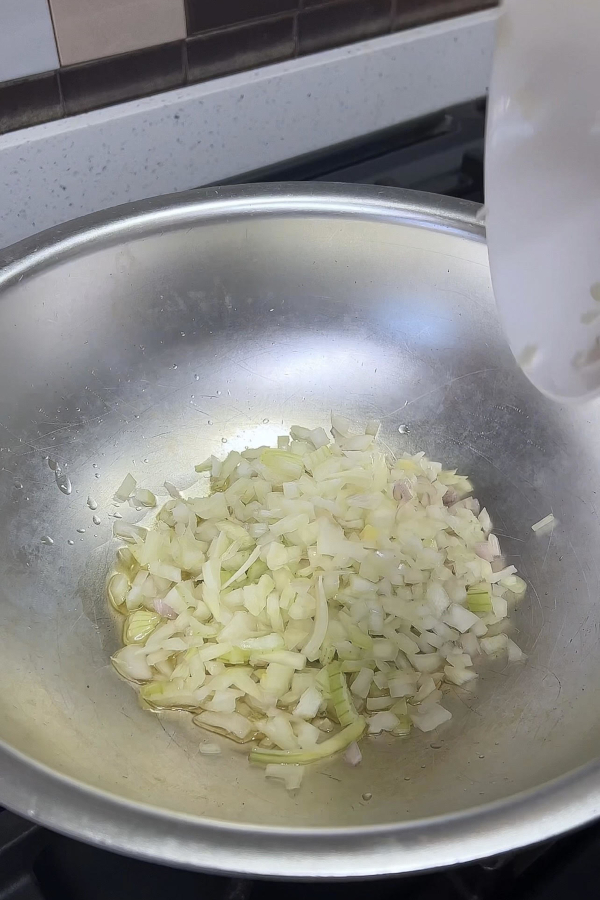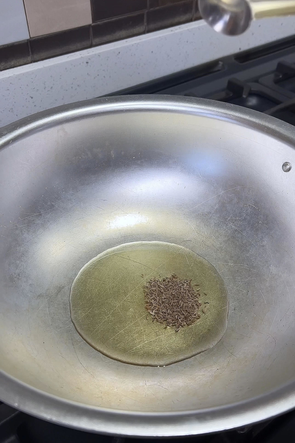 - In a pan over medium heat, add in oil and stir for 30 seconds. Add your cumin seeds and onions.