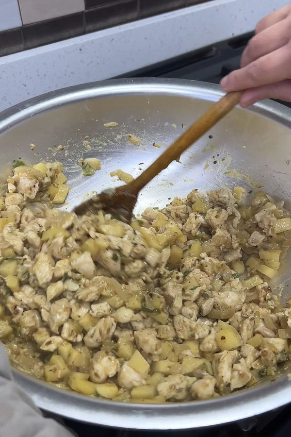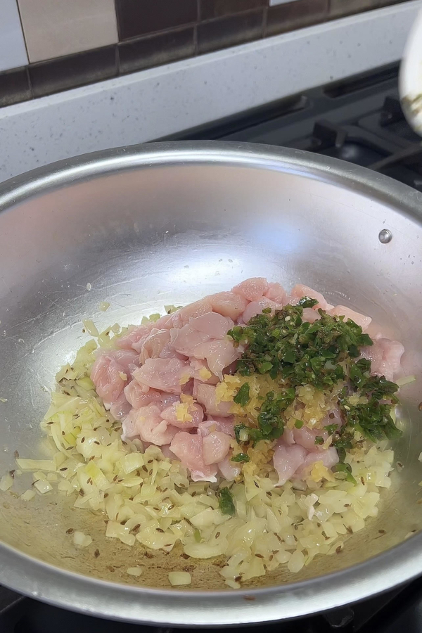 - Let the onion soften and brown slightly, then add in your chicken, garlic and chillies and stir until well combined. Cook until the chicken is white in colour and cooked through.