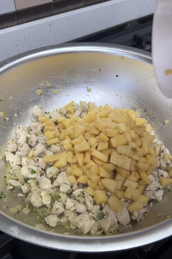- Mix and cover for 10 minutes until the potatoes have cooked through and have softened slightly.