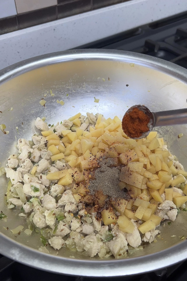 - After 4-5 minutes, mix in the potatoes and all the following spices; salt, chilli flakes, black pepper and chilli powder.
